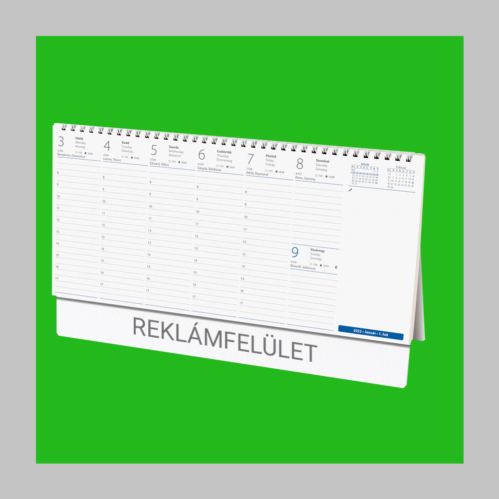 Ajándékozzon asztali naptárakat partnereinek, ügyfeleinek! Könyöklőink, heti tervező naptáraink, álló és fekvő asztali naptáraink mind rendelkeznek reklámfelülettel, ahova az Ön elképzelései szerinti grafikát, logót, elérhetőségeket nyomtatjuk. Számos típushoz rendelhető egyedi előlap, ami további reklámfelületet biztosít. A minimális rendelési mennyiség 50 db.