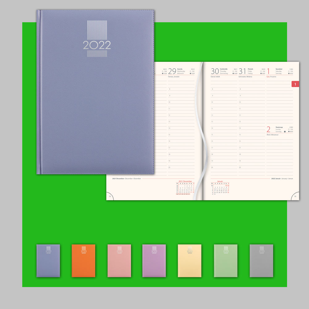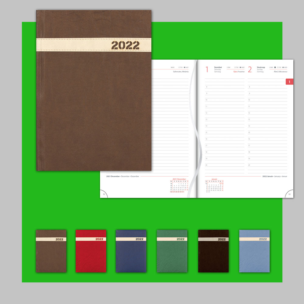 • a tömb mérete: A/5 napi vagy B/5 heti, krém színű belső oldalakkal